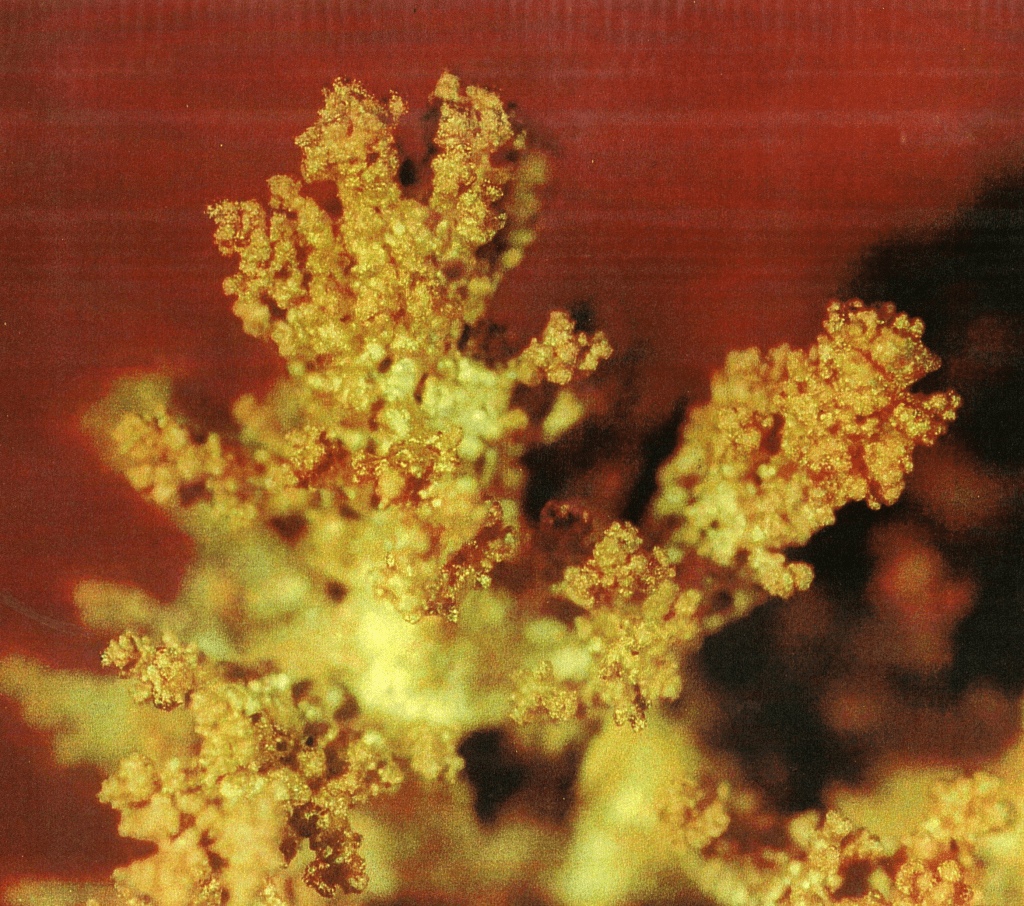 Gold grown using a parabolic mirror and focused powers of the Sun and Moon. Arborescent Gold Crystals grown around the head of a pin. Pin stuck in a cork for display. Proof that gravity has been controlled and directed.